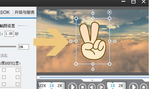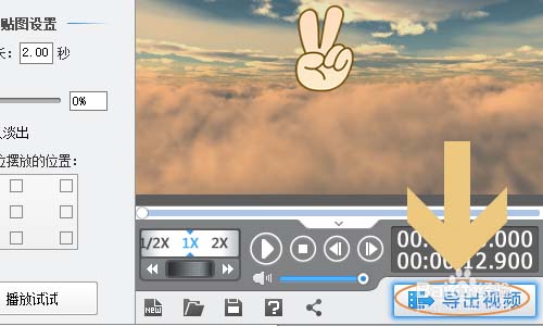 5、點擊確定以后,軟件右側的視頻上方就會看到這個貼圖表情了,我們還可以拖動邊框更改貼圖的大小和傾斜角度,最后點擊“導出視頻”即可將添加貼圖的視頻保存下來了;