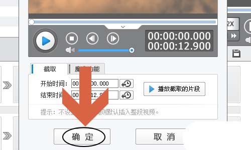 2、在視頻預覽窗口,我們直接點擊“確定”,這樣軟件的右側即可查看到該段視頻的播放界面了,如圖二...