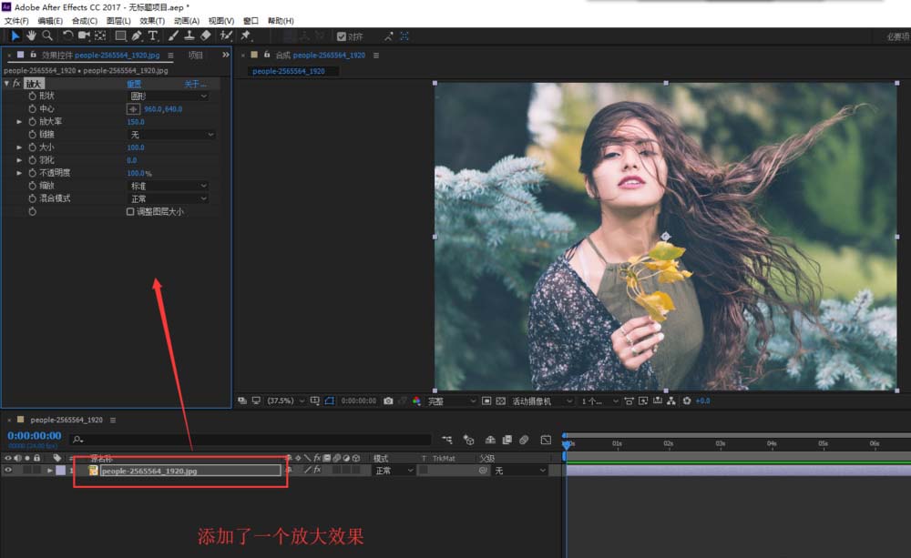 4、鼠標單擊扭曲中的放大效果,這樣就給圖片素材添加了一個放大的AE內置效果,我們在效果與預設窗口中也能看到這個放大效果設置。