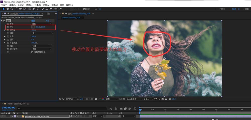 5、在放大效果屬性設置參數中選擇中心設置,調整X軸與Y軸的數值參數,這樣能看到一個移動的圓形區域,將這個區域移到我們要局部放大的地方。