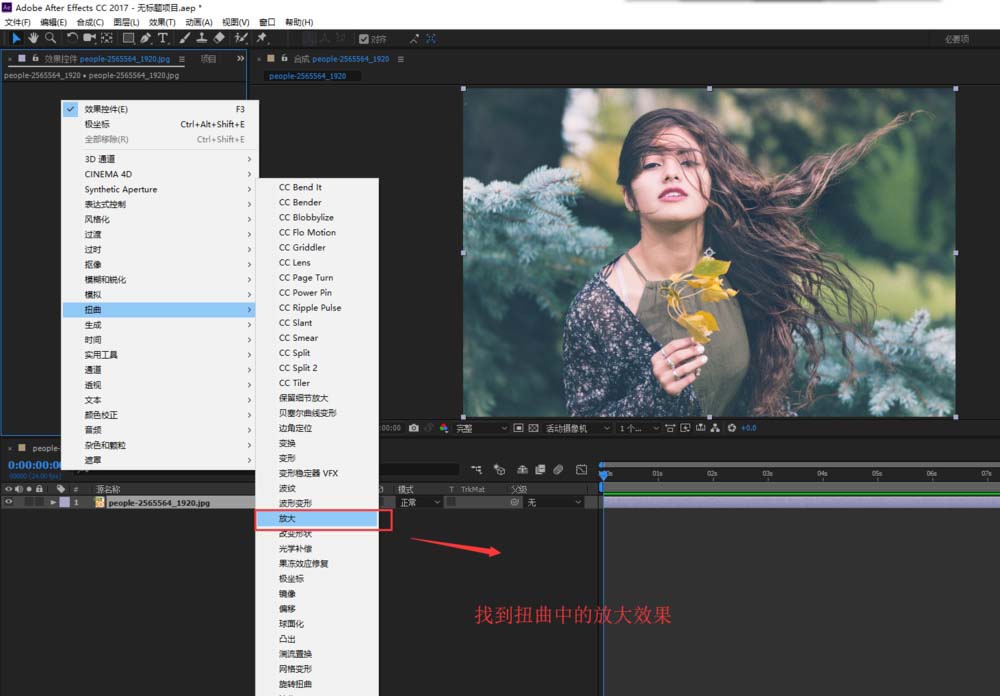 3、選中合成的圖片素材圖層,在效果與預設窗口中右鍵鼠標,在右鍵選項中選擇扭曲中的放大效果。