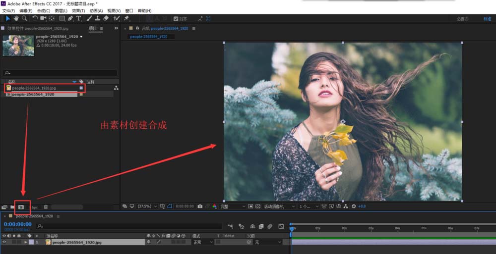 2、將導入的素材圖片選中并按住鼠標左鍵不松,拖動鼠標到新建合成按鈕上松開鼠標,讓AE根據這個素材來創建一個對應的合成。