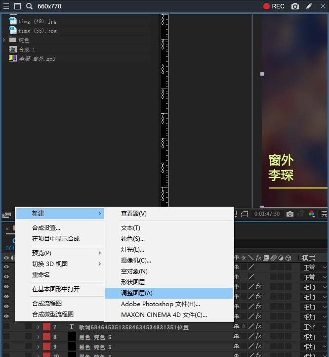 5、在頁面左下方的合成面板當中,新建一個空白的調整圖層