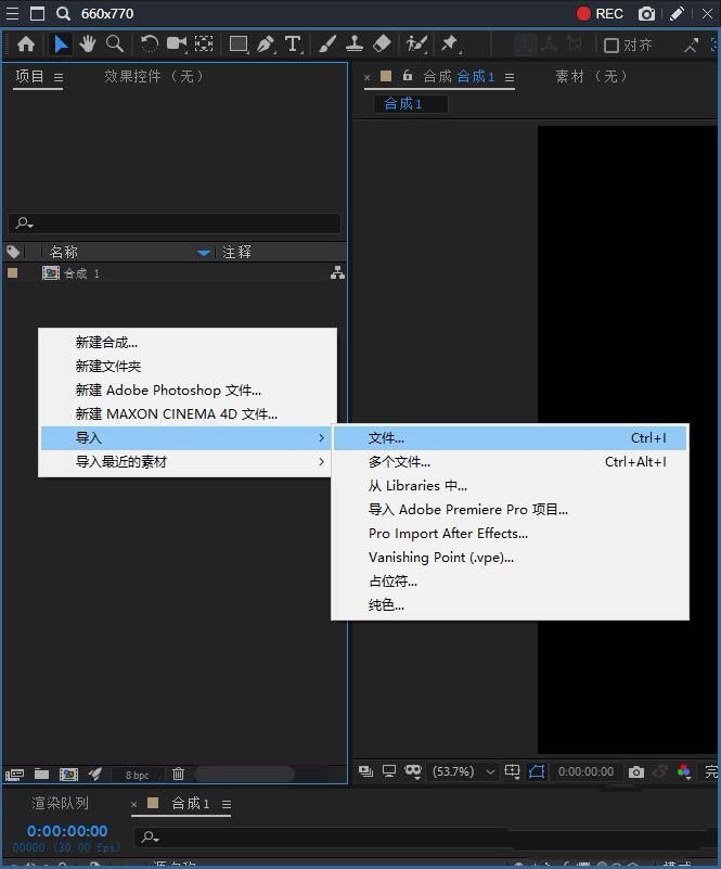 3、在左側項目面板中,選擇導入文件和素材