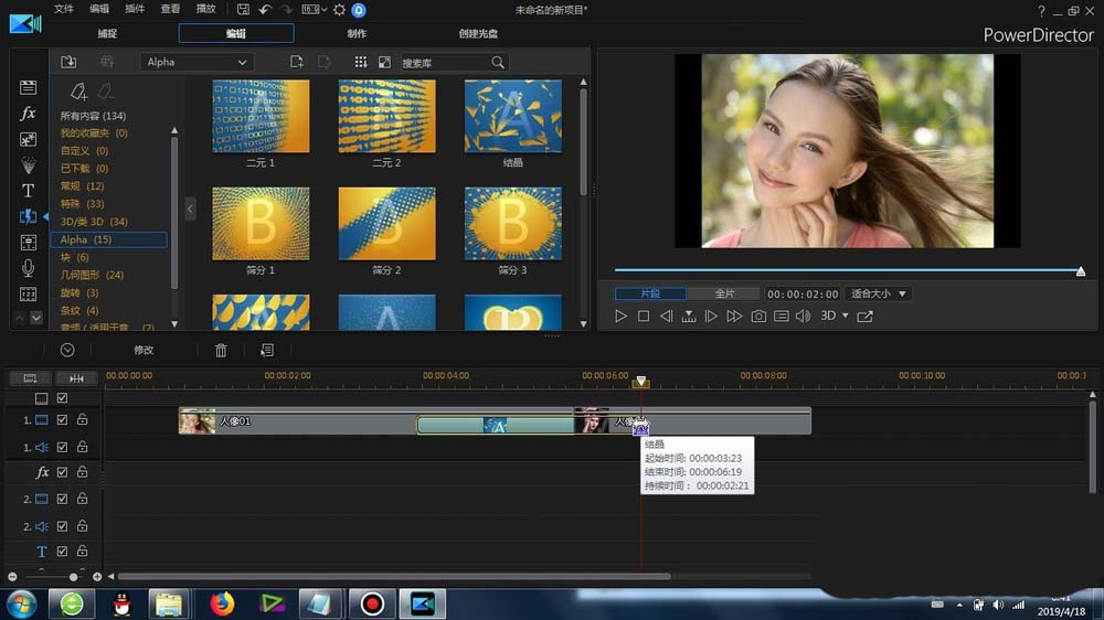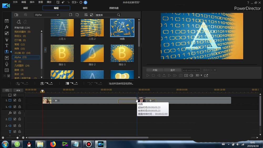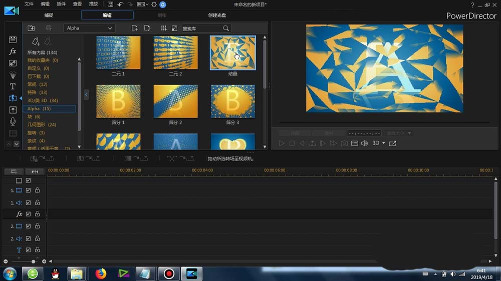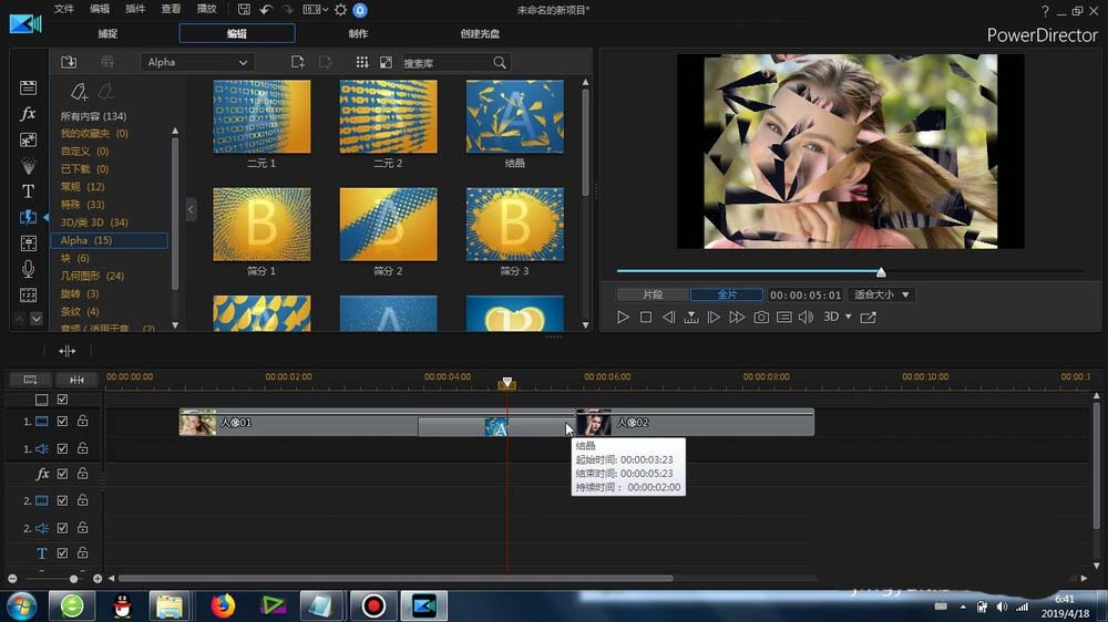 1、這里的“結晶效果”轉場是在威力導演里面的-轉場-alpha-里面可以找到