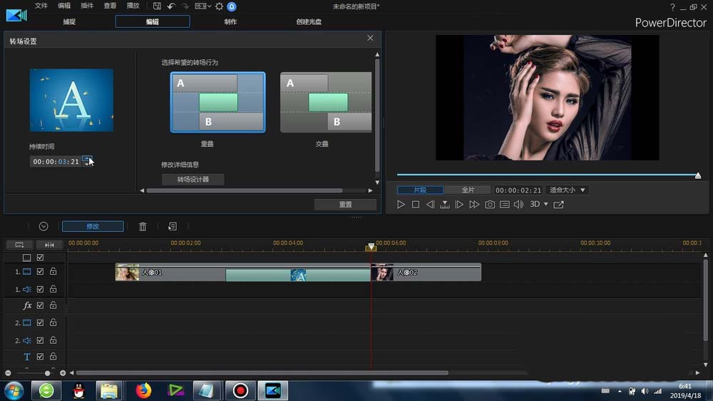 5、雙擊這個轉場標識,可以打開其設置窗口,可以設置它的特效持續時間、轉場的行為以及轉場的方向
