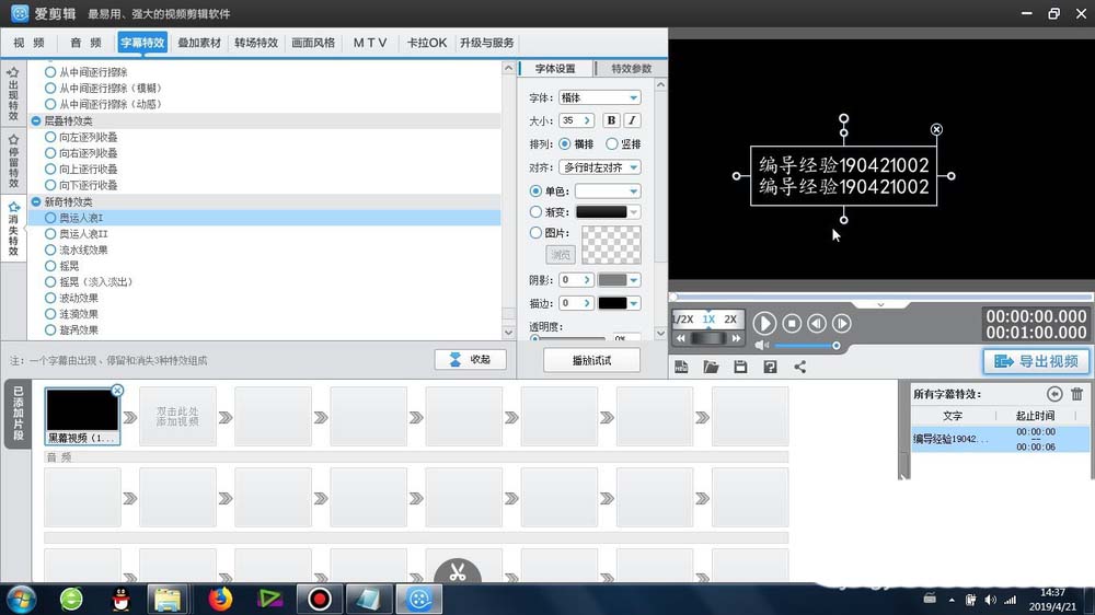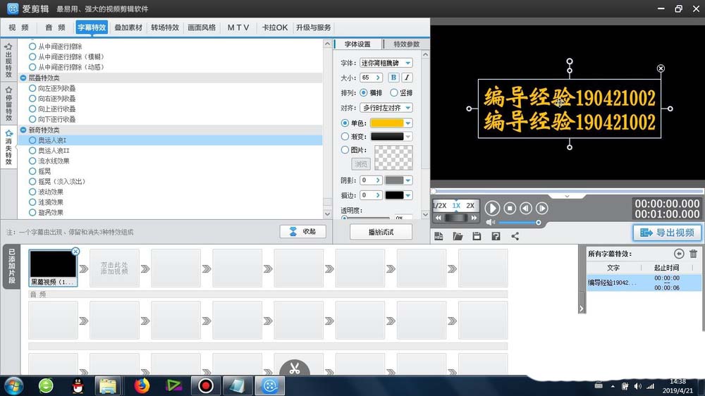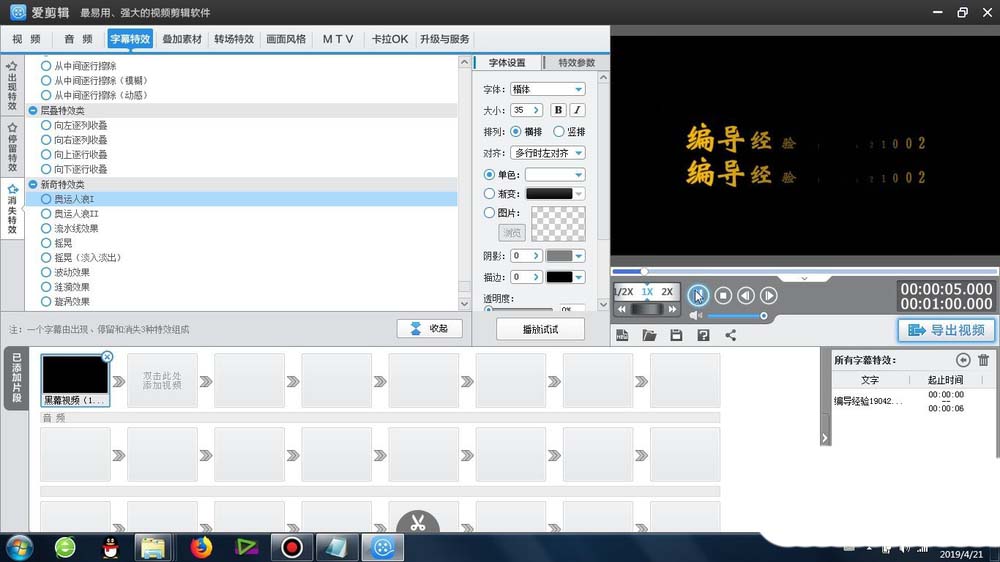1、這個奧運人浪2效果的存在位置是:字幕特效-消失特效-新奇特效類,一定要找到