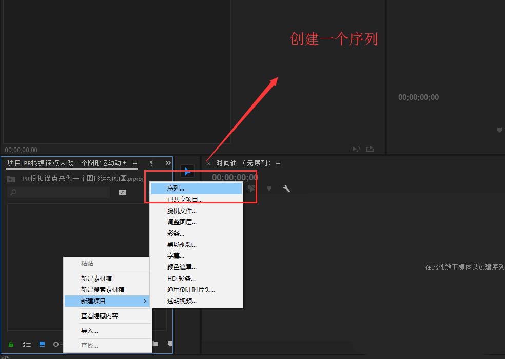 2、在新建的項目窗口右鍵鼠標,在彈出的右鍵數遍選項中執行新建中的序列命令,來創建一個序列。