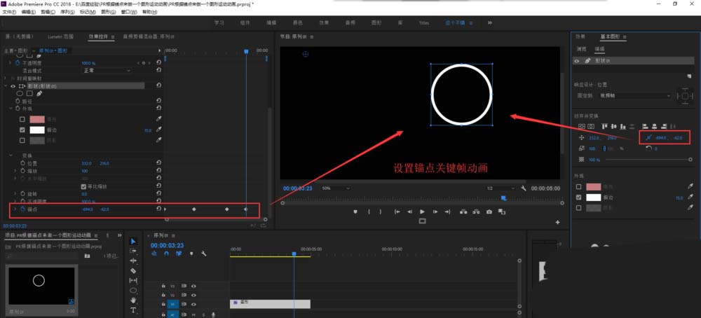 5、在效果控件或者是基本圖形窗口中找到錨點設置,為錨點設置關鍵幀,然后移動時間軸在設置錨點位置,做出一個錨點位置移動的關鍵幀動畫。