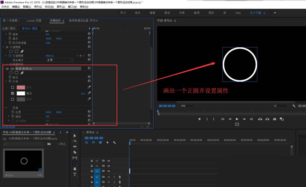 4、按住Ctrl+Shift鍵繪制一個大小合適的正圓出來,并通過效果控件中的形狀來設置這個正圓的參數,比如填充與描邊等。