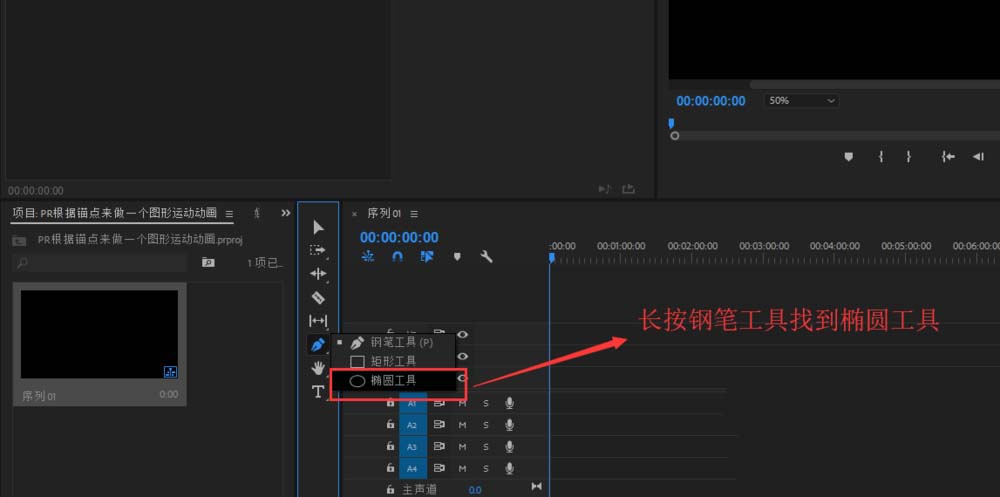 3、找到PR工具欄中的鋼筆工具,鼠標左鍵長按這個鋼筆工具,打開工具組找到橢圓工具。