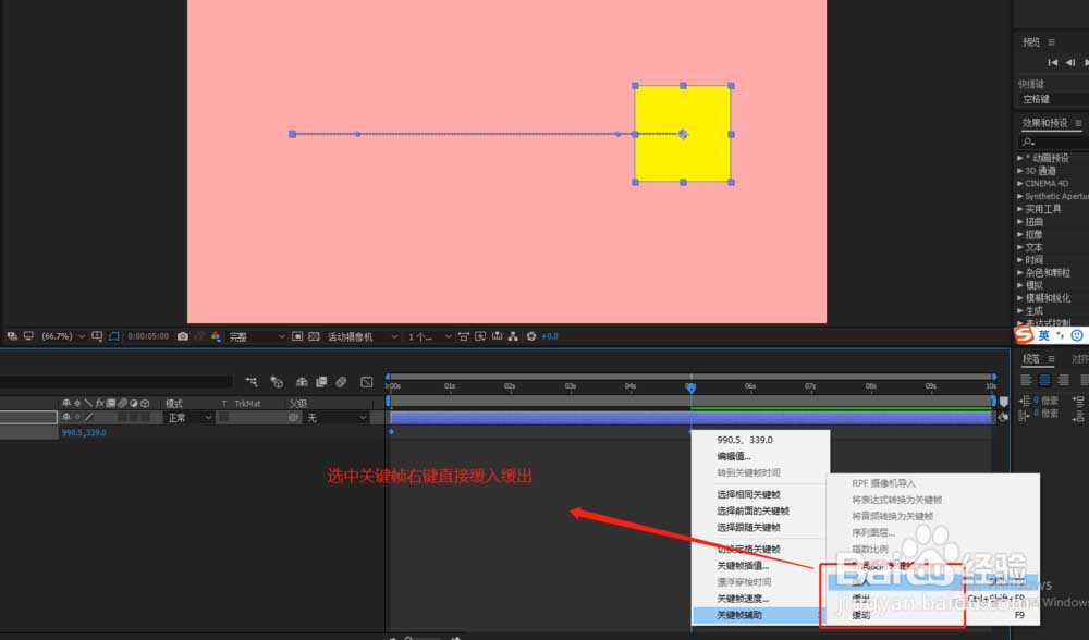 5、拖動鼠標選中所有關鍵幀,然后右鍵鼠標,在右鍵鼠標選項中執行關鍵幀緩入緩出,這樣可以自動為運動曲線設置緩入緩出效果。