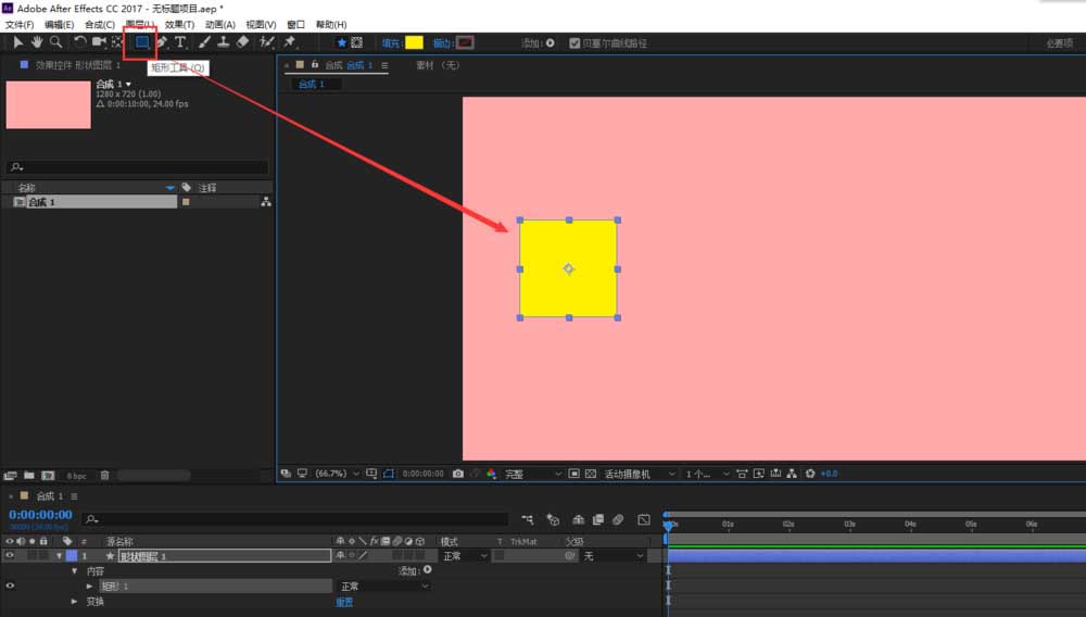 2、選擇上方工具欄中的矩形工具,使用矩形工具在合成中繪制出一個矩形出來,并設置更改其填充與描邊顏色等屬性。