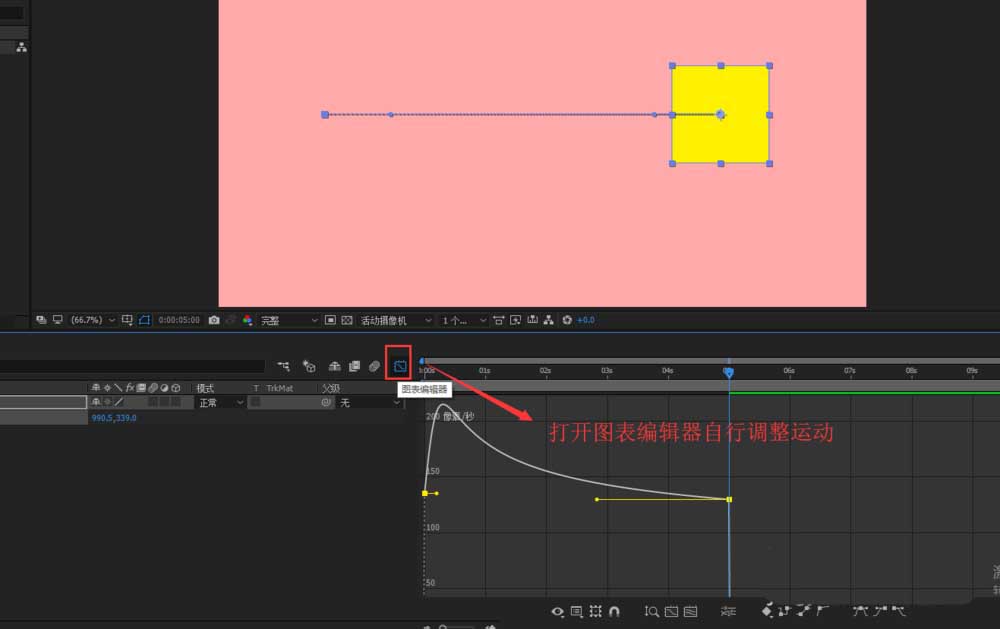6、我們還可以點擊圖標編輯器,展開顯示關鍵幀的運動曲線,對這個曲線進行自行調整,不同的曲線都會有不同的運動效果。
