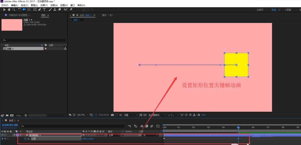 4、在位置上打入關鍵幀,然后在第五幀的時候在打入一個位置關鍵幀,并設置位置的水平參數。這樣就設置了一個矩形的運動關鍵幀動畫。