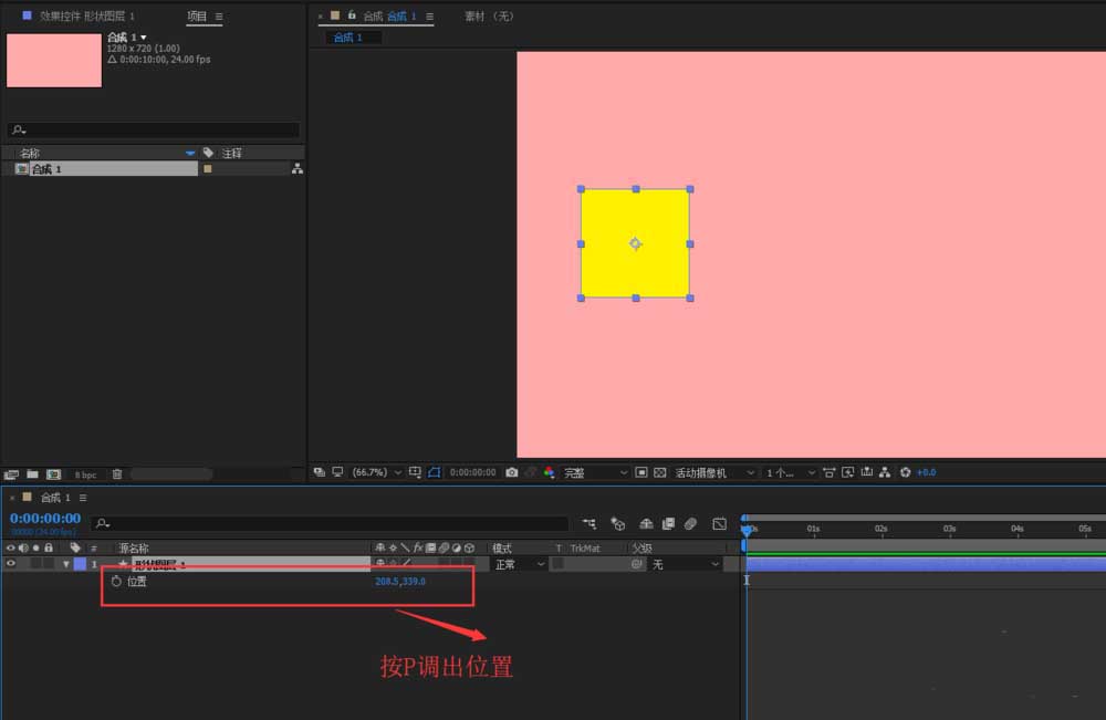 3、選中繪制的矩形圖層,按快捷鍵P鍵,然后可以調出這個矩形的位置屬性效果設置。