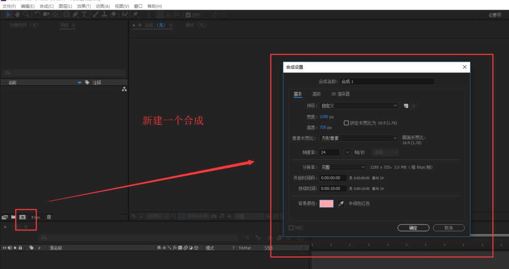 1、打開After Effects軟件,找到并點擊新建合成這個按鈕,然后在合成設置中調整參數并創建一個AE合成。