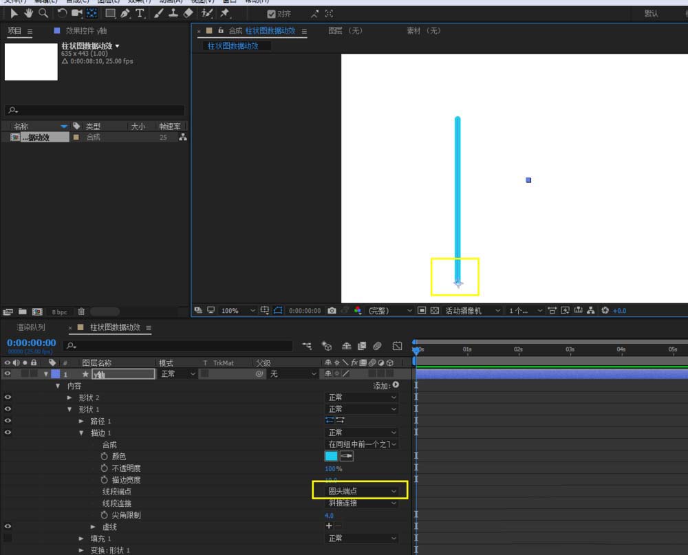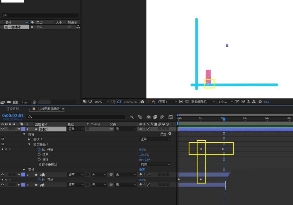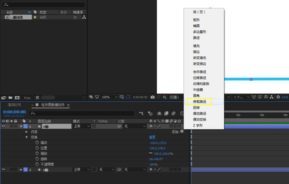 1、繼續用鋼筆工具畫豎狀數據條;同理添加修剪路徑效果,開始的屬性值調整為0;給結束屬性k關鍵幀,開始為0不顯示,結束為100完全顯示;在xy軸完全顯示之后出現;