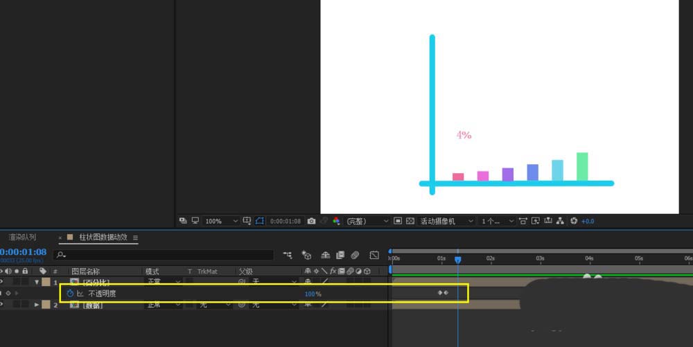4、選中編號和百分比圖層,ctrl+shift+c預合成;給預合成的不透明度k關鍵幀,前面不顯示,等數據條出現的時候,開始統計數值;其他數據條的統計數值,以此類推的去實現;