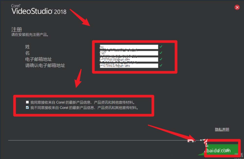 5、點擊下一步之后,輸入你的姓名、電子郵箱,點擊同意或者不同意接收信息,之后點擊下一步,如圖所示。不填寫信息是安裝不了的。