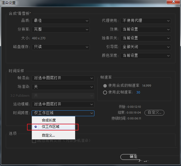 4、自動跳轉到渲染隊列面板,點擊“最佳設置”,彈出渲染設置對話框,在下面的"時間跨度"選項,下選擇“僅工作區”,確定。