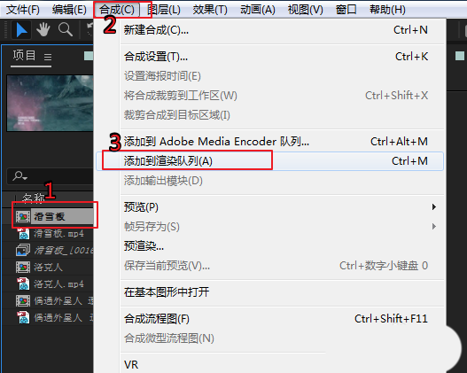 3、選中剛才新建的合成,選擇菜單欄——合成——添加到渲染隊列。