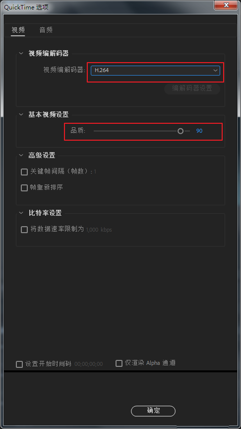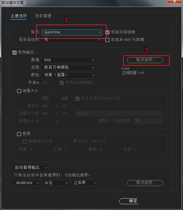 6、點擊“輸出模塊”旁邊藍色的“無損”二字,彈出對話窗口,在格式下選擇QuickTime,然后點擊格式選項,彈出對話框,選擇視頻編碼器為“H.264”,在下邊選擇品質為90。連續點確定,退出。