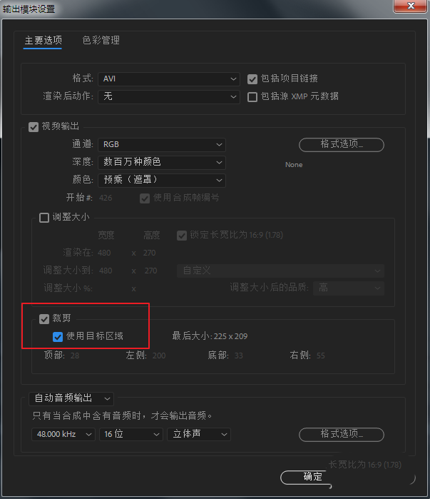 1、使用預覽窗口的裁剪工具裁剪視頻,然后輸出時勾選使用目標區域。