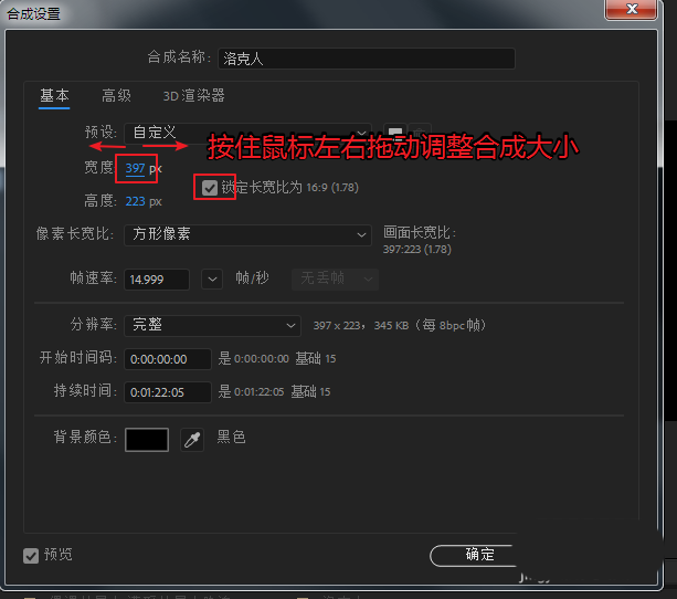3、然后把鼠標放到寬度數值上,按住鼠標左右拖動調整合成大小。