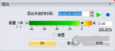 4、在選中原文件后,選擇“編輯——混合”,彈出混合窗口,選擇混音開始的時間,比如“00:00:05.00000”就是在音頻的第5秒添加水印。并選擇音量,建議盡量將聲音調低,防止影響到原文件的效果。
