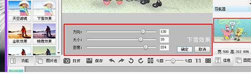 2、在此下雪效果功能的中調整下雪時雪花的方向、大小與密度,每個照片適合的數值都有所不同,所以還 是要根據實際情況進行設置的,最后點擊“確定”即可,如下圖所示: