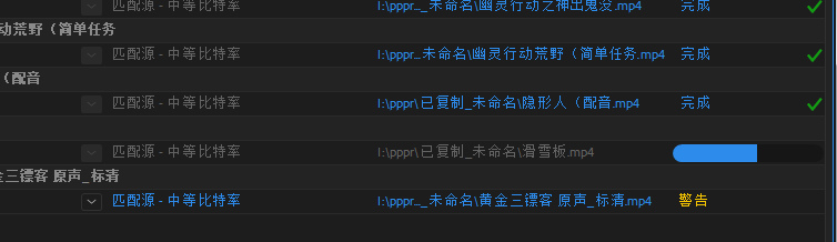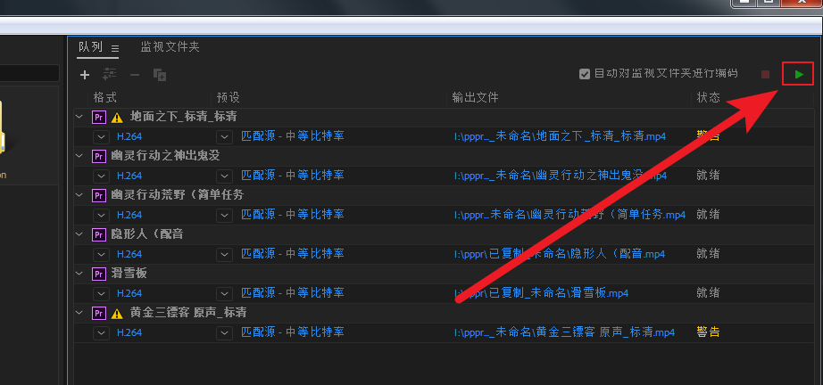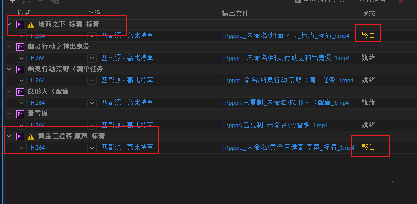 7、有時從PR導出ME時,會發現部分視頻彈出黃色嘆號警告。這是由于源元素的編碼、尺寸比、幀率等問題造成的。解決辦法,對個別不識別的素材,在ME批量渲染導出后用PR單獨渲染。