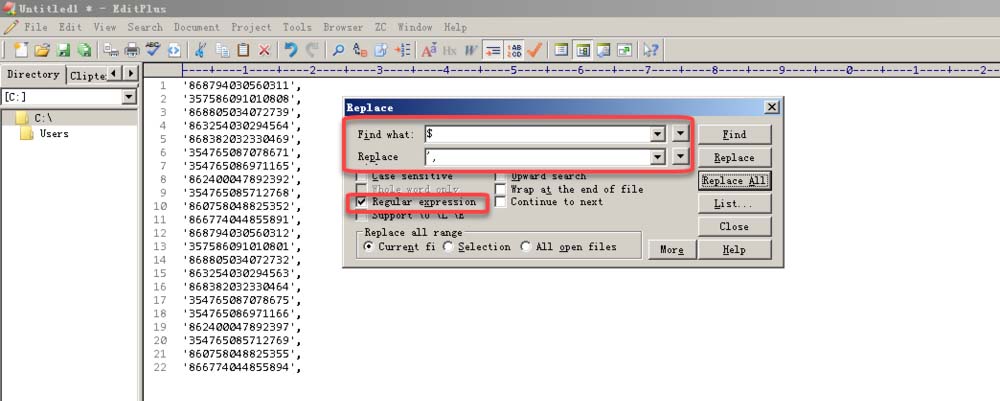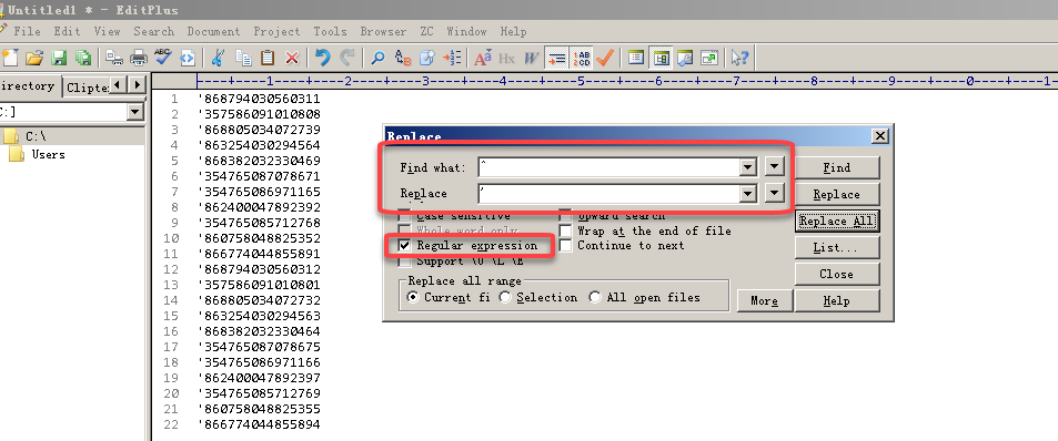 3、將SQL用到的選項文字復制到EditPlus,此時用快捷鍵【CTRL+H】打開【Replace】窗口,在該窗口中【Find what】后面的框框中輸入【^】,在【Replace】后面的框框中輸入【'】,并將下方的【Regular expression】選項勾上并點擊【Replace All】按鈕。此時每一行文本前都加上了單引號。