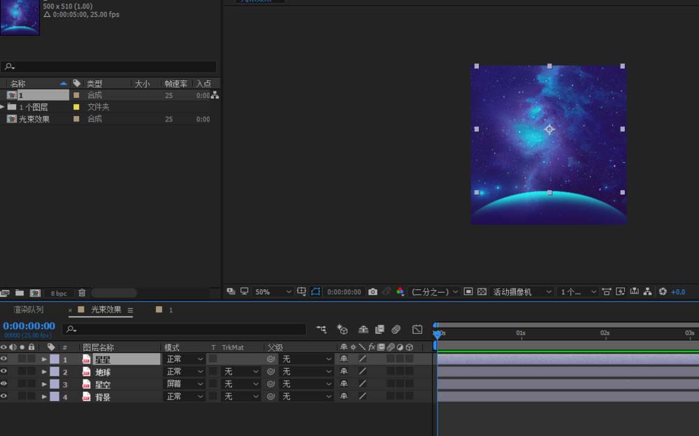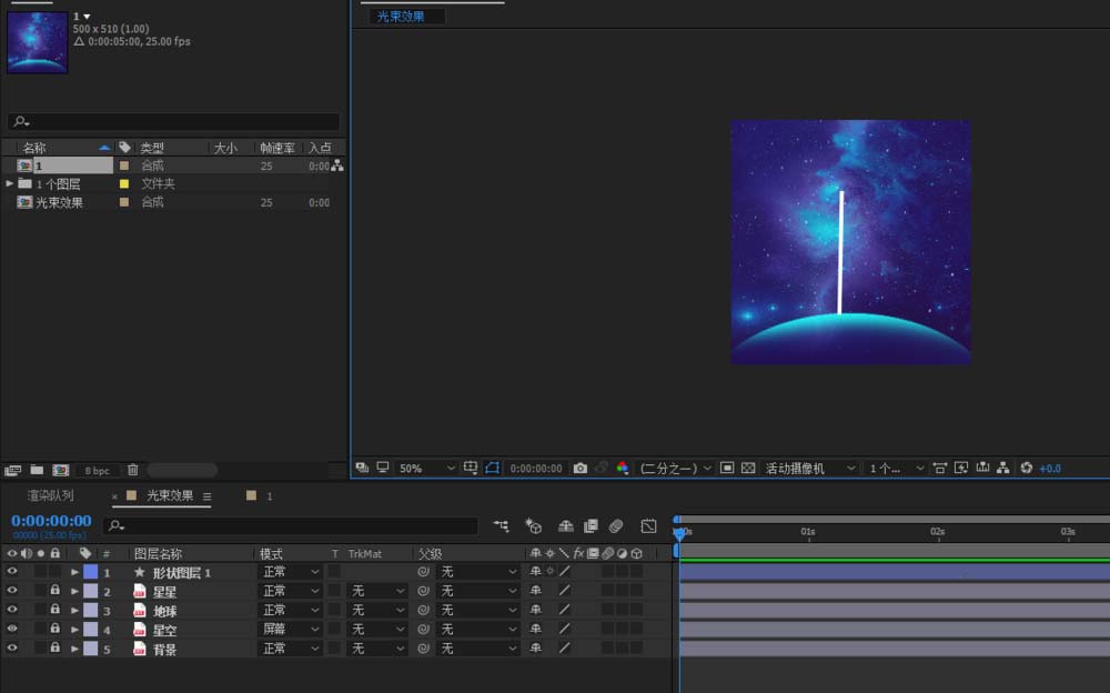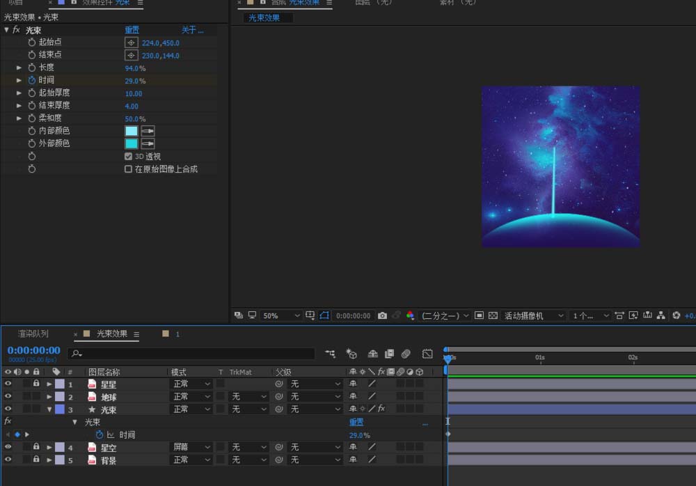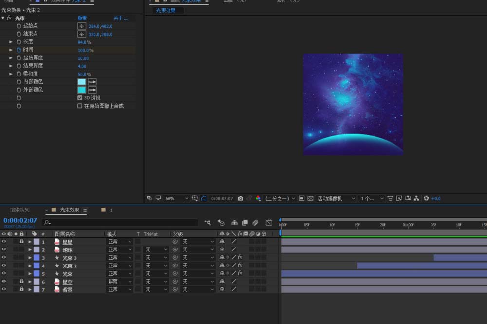 6、調節光束的起始點和結束點,調節光束的長度和顏色等信息,給時間屬性K關鍵幀;開始為原始值,結束為100%,實現一個光從地球發射到宇宙的一個過程;