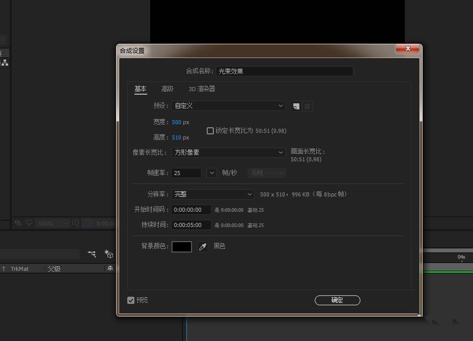 1、打開AE軟件,新建合成,命名束效果,調整相應的參數。