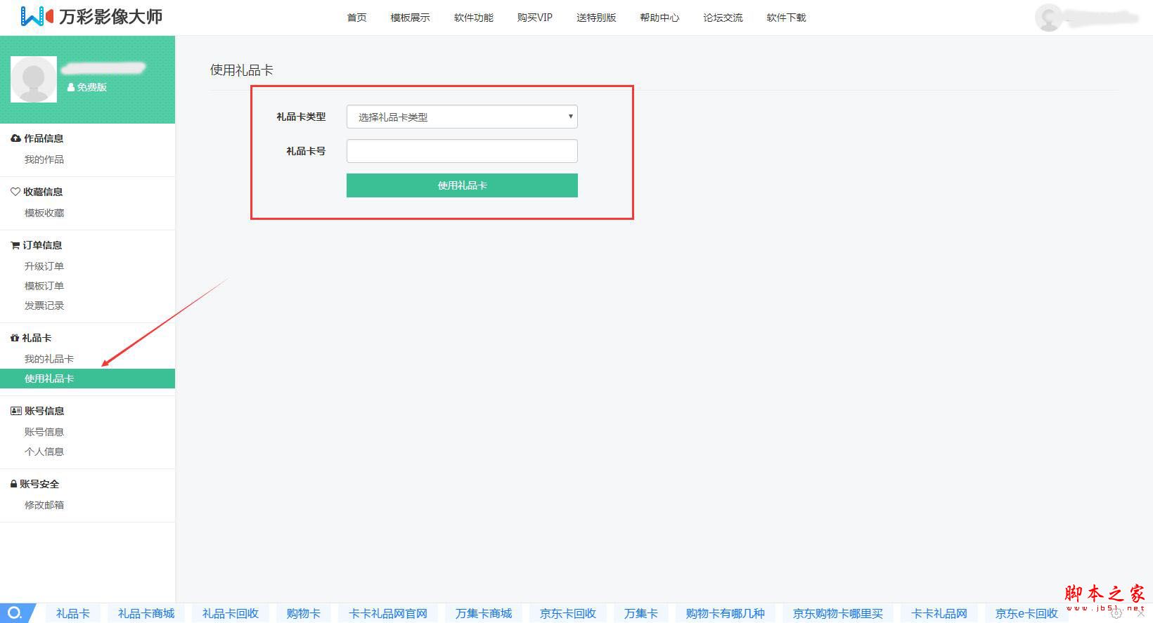 2.進入賬號信息后臺界面,單擊使用禮品卡,輸入激活碼
