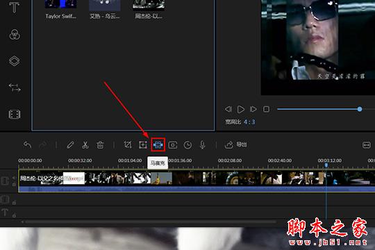 2、由于軟件是默認不自動選擇視頻的,所以大家需要在下方選中視頻,之后點擊時間線上方的“馬賽克”功能選項,此功能就是今天所說的主角,點擊之后即可開始添加馬賽克,如下圖所示: