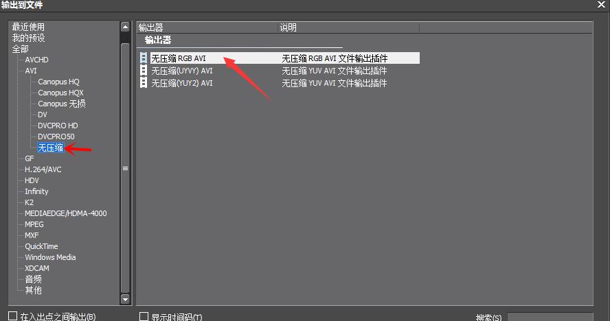 這時會彈出【輸出到文件】設置窗口,在左側點擊【無壓縮】,選擇【無壓縮RGB AVI】,點擊輸出,