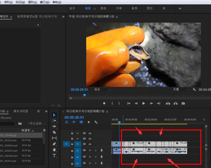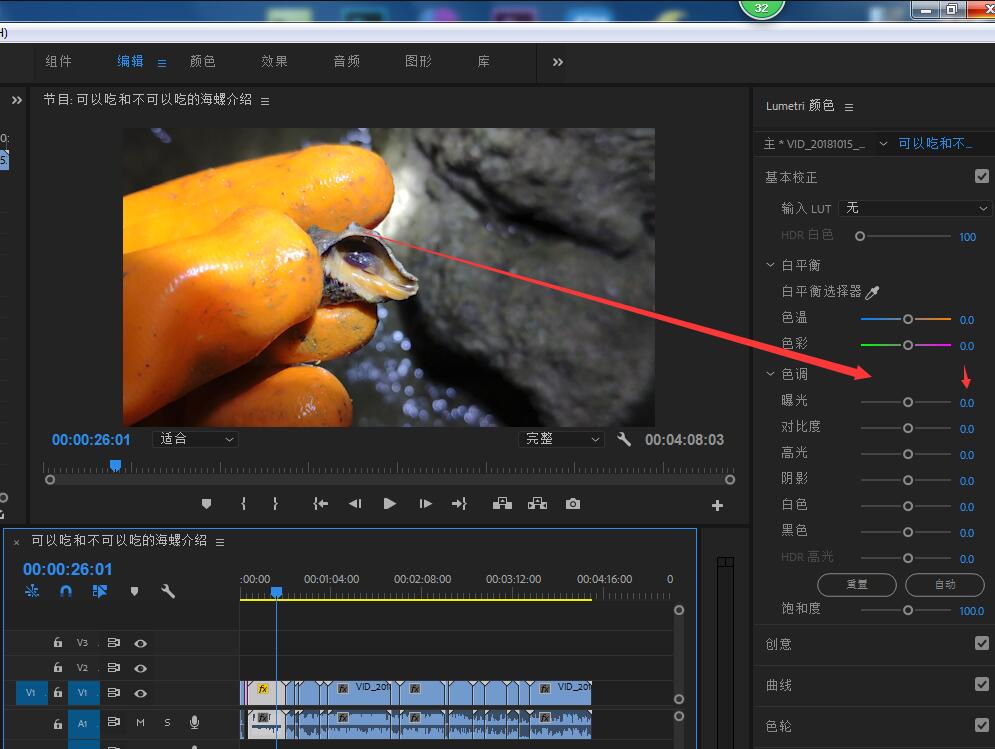 回到時間軸,選中要批量調整曝光的素材片段,看箭頭指示,