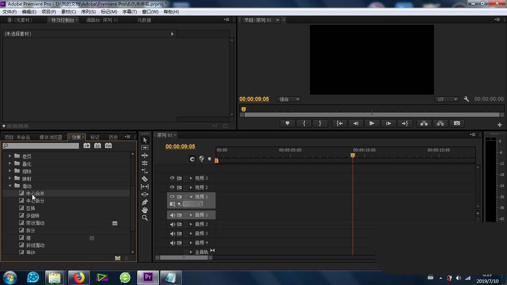 1、要做效果,一定要知道這個“中心合并”功能的位置:效果-視頻切換-滑動