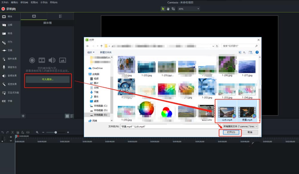 2、新建了一個空項目之后,執行導入媒體,在打開窗口中選擇兩個視頻媒體打開。