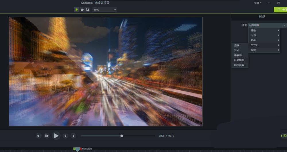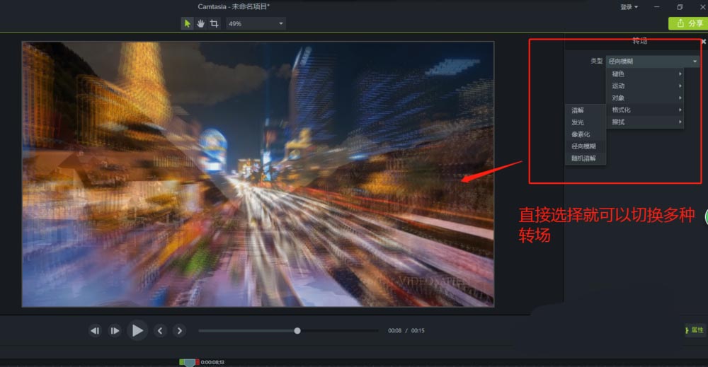 在Camtasia 9中有那么多的轉場,我們怎么知道哪個轉場適合我們的視頻效果呢?這時候就需要更改切換多種轉場來預覽找到你想要的那個轉場效果了。