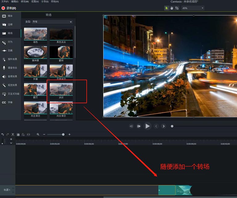 4、在Camtasia 9轉場選項中隨便選擇一個轉場效果,添加到兩個視頻之間。