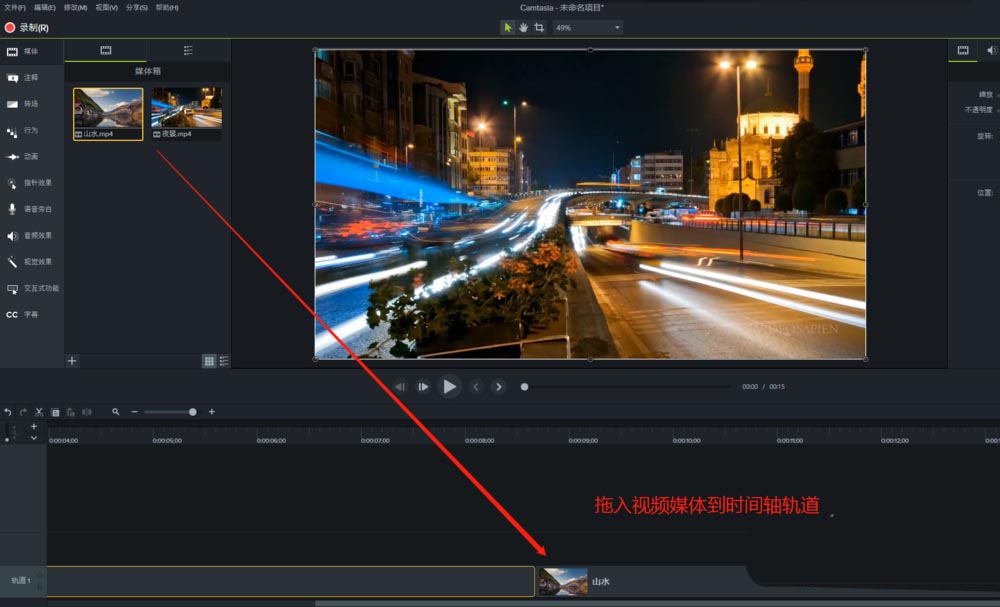 3、將兩個視頻媒體首尾相接拖動到時間軸軌道,并調整時間軸軌道的大小。