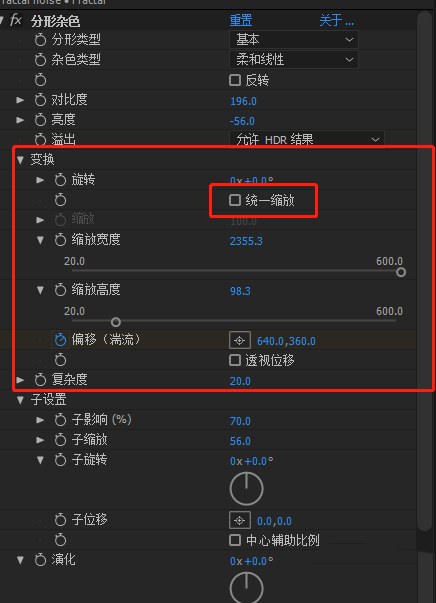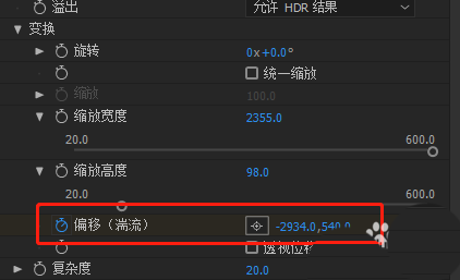 3、設置變換動畫:取消統一縮放的勾選;縮放寬度=2355;縮放高度=98;為偏移(湍流)K動畫,點擊偏移(湍流)旁邊的小鬧鐘:在第一秒設置數值為【640,360】,在第五秒(這個時間長度根據動畫所需調整)設置【-2934,360】