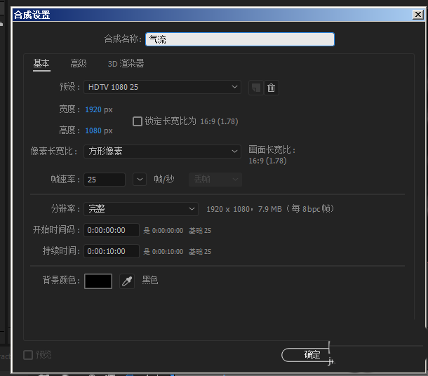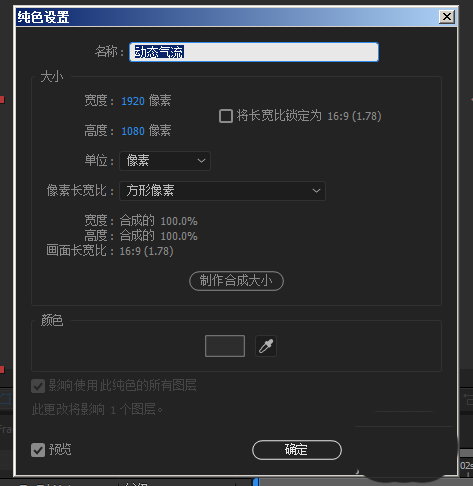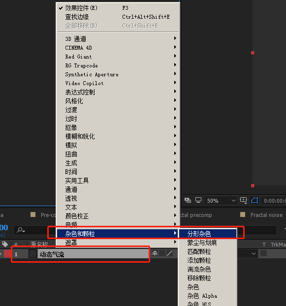 1、新建合成,名為氣流。在此合成里新建純色黑色的固態層,名為動態氣流,為此固態層添加效果-雜色和顆粒-分形雜色。