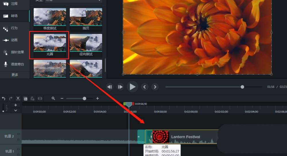 5、在Camtasia 9轉場選項中找到“光圈”效果轉場,選擇光圈效果轉場給軌道中兩個視頻素材添加,添加到這兩個視頻媒體中間。