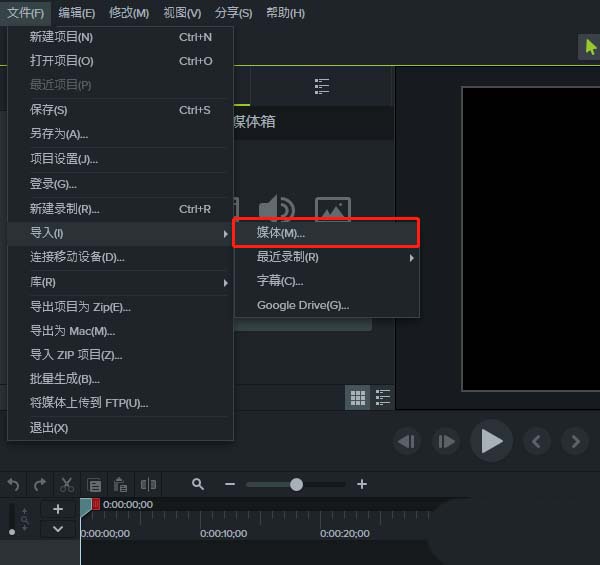 1、通過Camtasia 9軟件來生成一個項目,在這個生成的項目中執行文件菜單中的導入命令,選擇導入中的媒體選項。