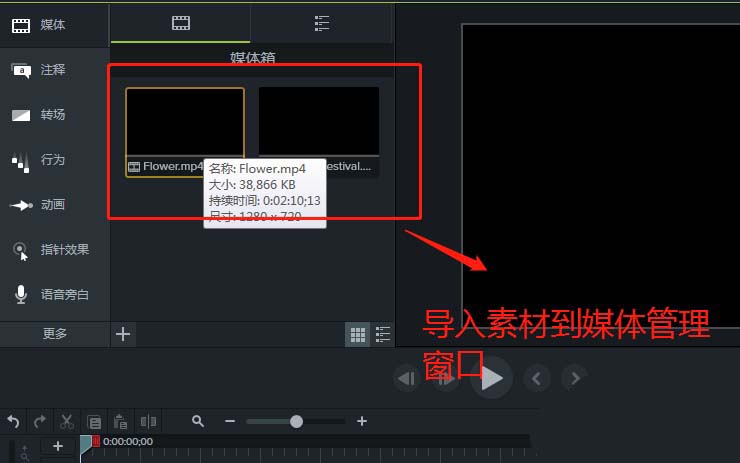 2、選擇執行導入中的媒體之后,就會彈出打開窗口,通過打開這個窗口可以選擇你要編輯的視頻素材媒體并打開,然后在Camtasia 9媒體窗口中就可以看到視頻素材了。