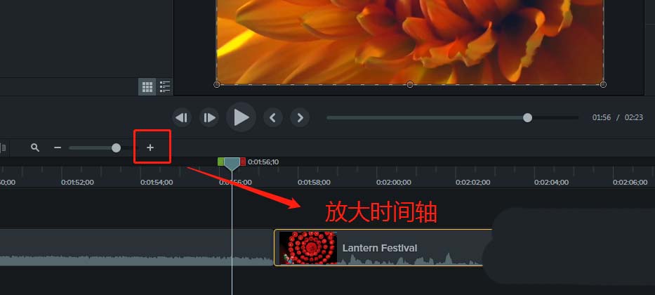 4、因為上一步中兩個素材時間軸長度比較小,所以點擊那個加號“+”放大時間軸。